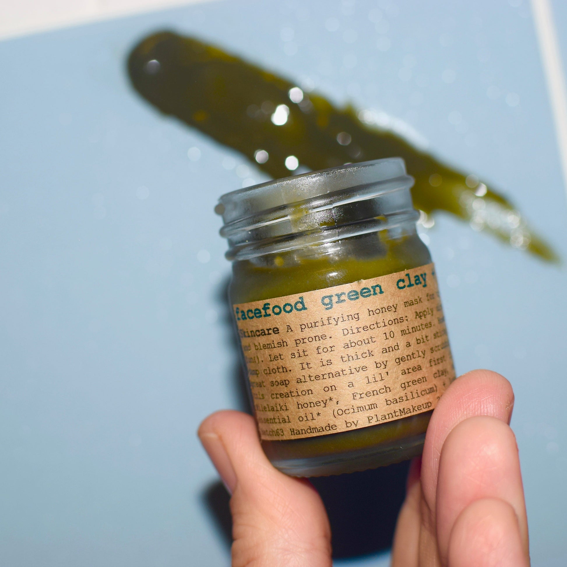 Ingredients: honey*, French green clay (Kaolinite, contains naturally occurring iron oxides), kelp powder* (Ascophyllum nodosum), basil essential oil* (Ocimum basilicum) + love. *purveyed certified organic ingredients