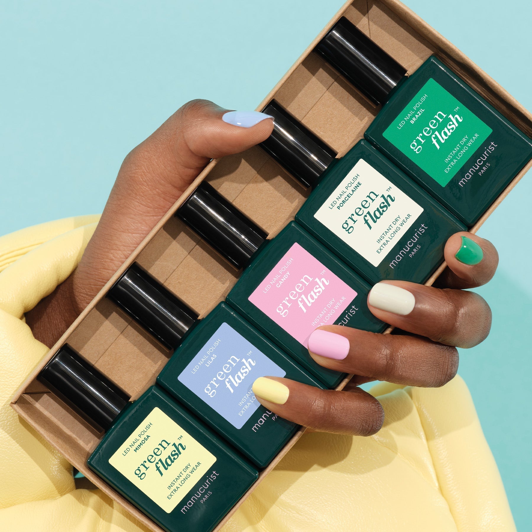 Find inside the 5 shades of the new Playful Wonderland Collection, in Green Flash? LED gel polish (Mimosa, Lilas, Candy, Porcelaine & Brazil) .