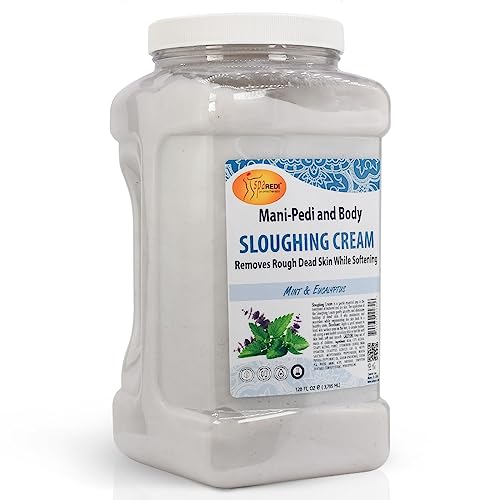 Details: SPA REDI – Mint & Eucalyptus Pedi Sloughing Cream 128oz, Exfoliating, Hydrating, Infused with Hyaluronic Acid, Amino Acids, Panthenol, and Comfrey Extract - Sloughing Cream is an essential step in the treatment of textured and dry skin. The application of the Sloughing Cream gently smooths and eliminates buildup of dead skin. Our Mint & Eucalyptus spa products come in a variety of textures for aromatherapeutic pedicure spa treatments. Our product is Paraben-Free, Sulfate-Free, Drying Alcohol-Free, Silicone-Free, and Cruelty-Free. We never test on animals. Made with Pumice and infused with Hyaluronic Acid, Amino Acids, Panthenol and Comfrey Extract, it also moisturizes and nourishes while regenerating the skin back to a healthy state. All our products are made in the USA and specially made with the highest quality ingredients. We have had the privilege of globally participating in the personal care industry since 1987. Directions: Apply a small amount to hard skin area on the feet. In circular motions, rub using a wet loofah scrubbing disk or foot file until skin feels soft and smooth. Rinse thoroughly with warm water.